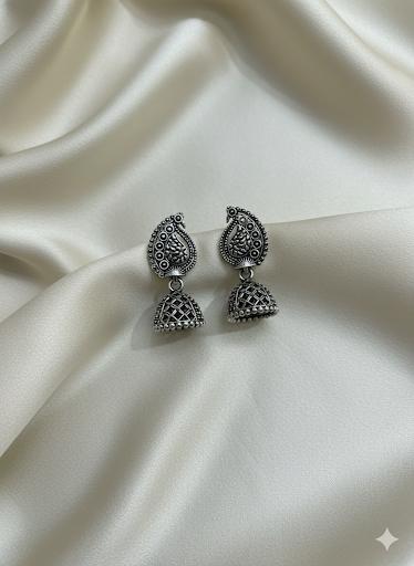 Discover the beauty of handcrafted elegance with these oxidised silver jhumkas. Made with detailed filigree work and a rustic antique finish, these earrings add a statement touch to any outfit. Perfect for festive wear, casual styling, and gifting, these jhumkas are a must-have accessory for every jewellery lover.