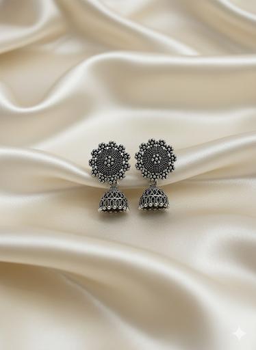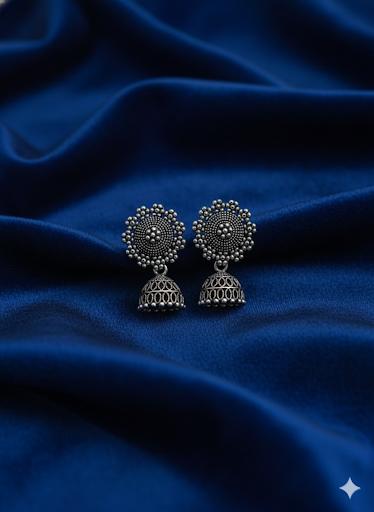 Discover the beauty of handcrafted elegance with these oxidised silver jhumkas. Made with detailed filigree work and a rustic antique finish, these earrings add a statement touch to any outfit. Perfect for festive wear, casual styling, and gifting, these jhumkas are a must-have accessory for every jewellery lover.